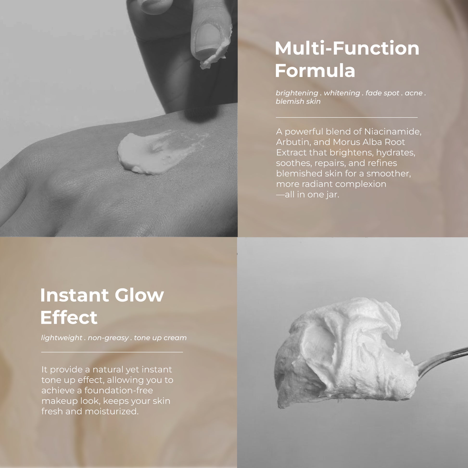 A powerful all-in-one repair cream that contains Arbutin, Morus Alba Root natural extract and Niacinamide to effectively brighten, soothes and repair skin, effectively fades dark spots, whitening the skin, and fights acne and blemish skin. While provide an instant tone up effect, an ideal alternative for foundation-free makeup!